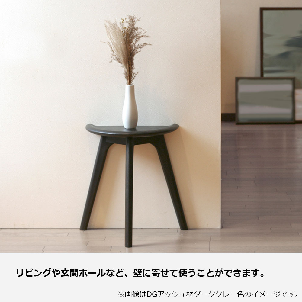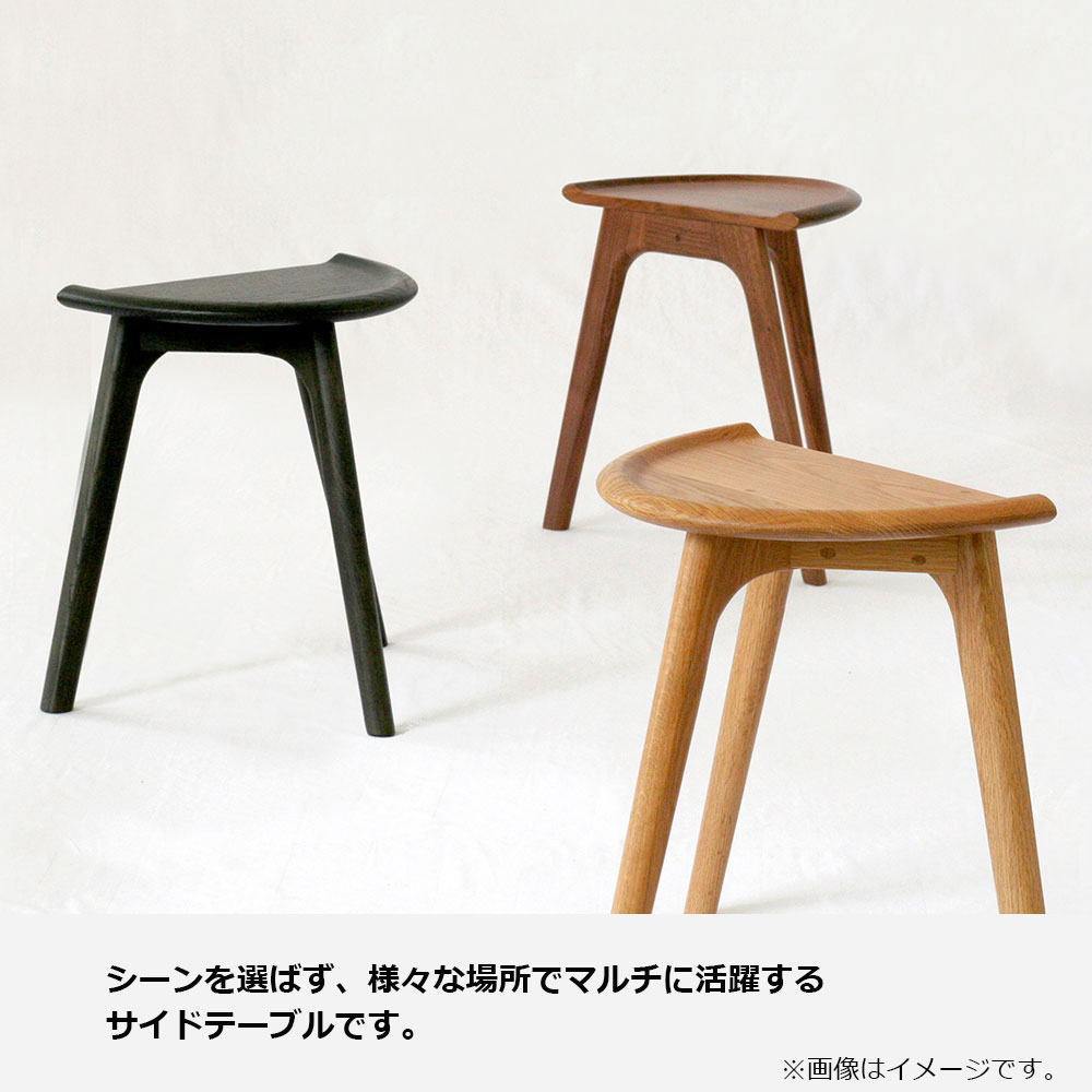コンパクトな半円形で、ソファやベッドのサイドに置くことで圧迫感のないレイアウトが可能です。2台を組み合わせて楕円形のテーブルとしてもお使いいただけます。※画像はWOオーク材を使用したイメージです。