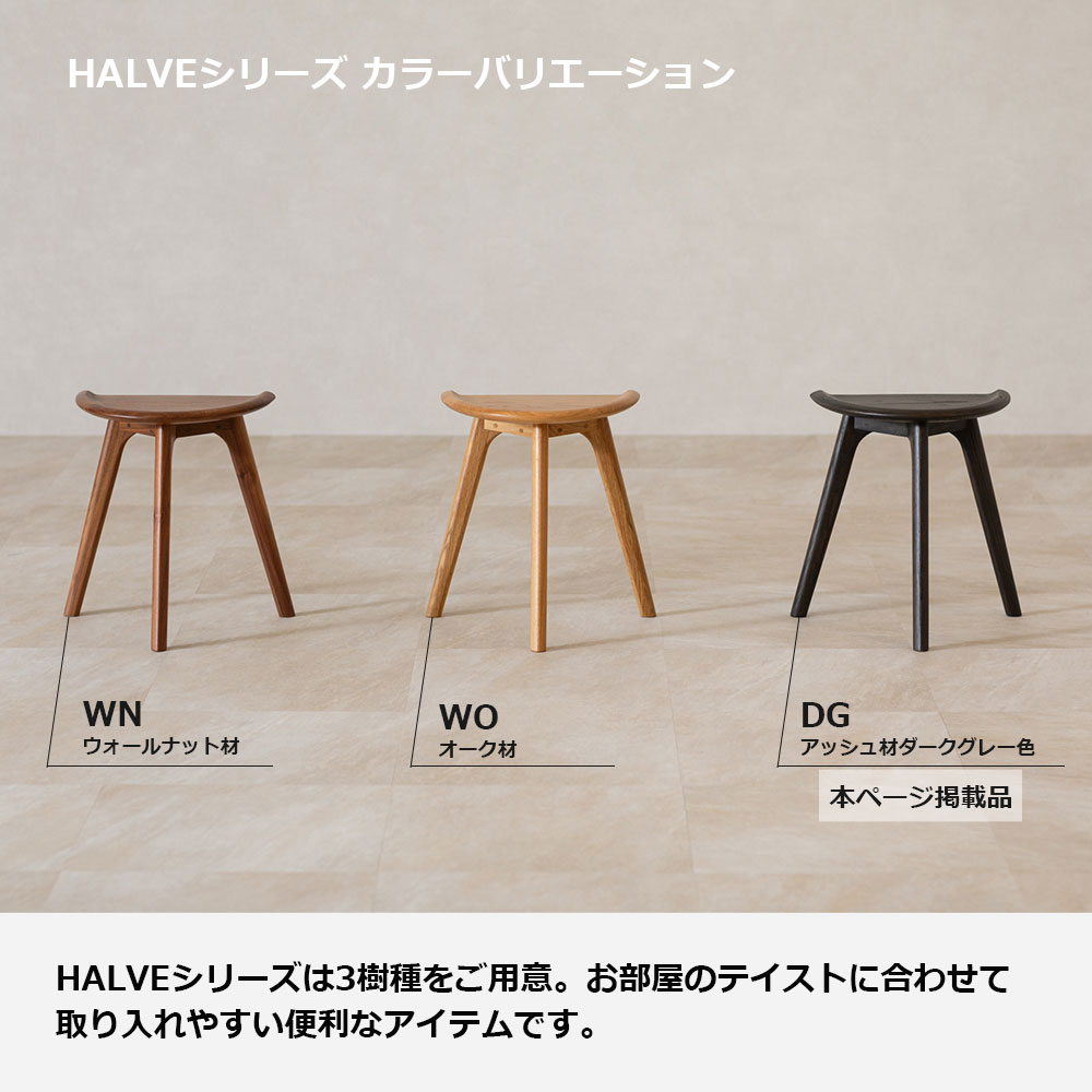 「HALVEハーブST」シリーズは、DGアッシュ材ダークグレー色(本ページ掲載品)のほか、WNウォールナット材、WOオーク材の合計3樹種から選べ、お部屋のテイストに合わせて取り入れやすい便利なアイテムです。