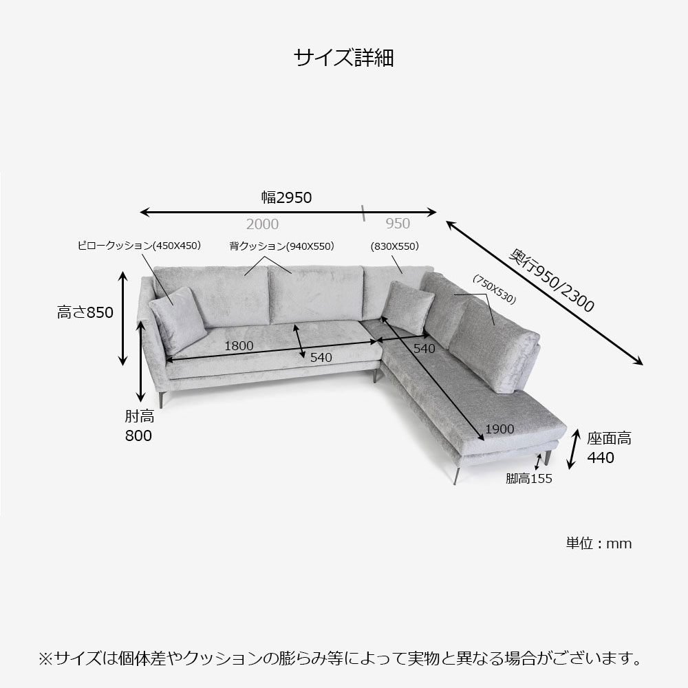 | カウチソファ(向かって右肘) | 幅950x奥行2300 |