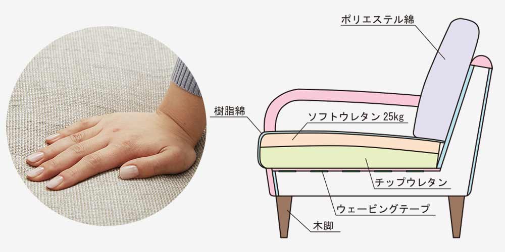 クッション(座):ウレタンフォーム、ポリエステル樹脂綿、ウェイビングテープ