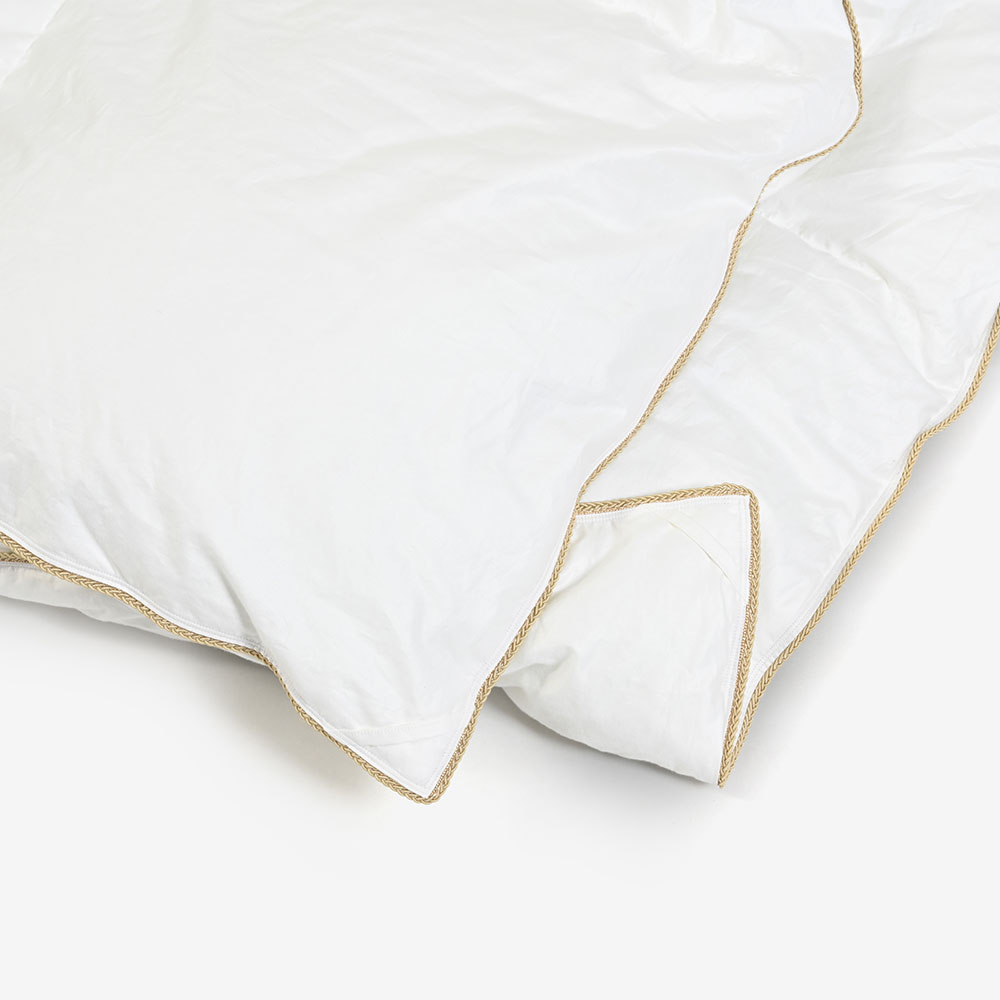肌に触れる面の8割はしなやかなインド綿100番手(ヨコ糸)、タテ糸にはしっかりとした80番手を使用した側生地は軽く、通気性に優れています。打ち込み本数435本の高密度なサテン織りはしなやかで光沢感に優れ、羽毛の吹き出しやダニの通過も防ぎます。
