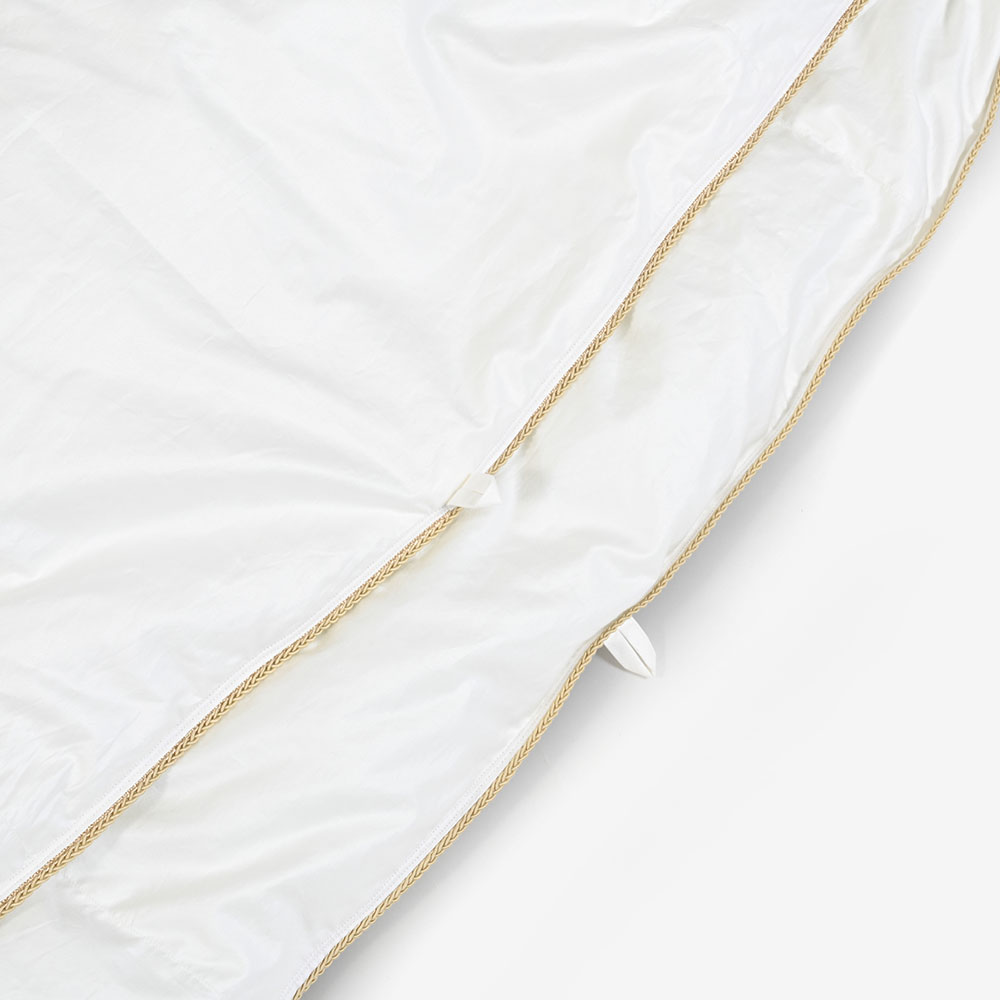 生きたダニを羽毛に寄せ付けない加工です。細かく織り込まれた高い番手の側生地をダニが通過することもありません。また、専用の保管ケースにも防ダニ加工が施されていますので、オフシーズンも安心です。