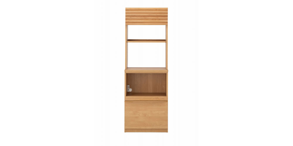 上台の上部はフラップ扉(引き上げ扉)で中が見渡しやすく、出し入れが楽に行えます。下台には家電収納スペースと深引出し収納があり機能的にお使いいただけます。オープンシェルフ部分には可動棚が1枚あり50mmピッチ7段階で調整可能で、キッチンツールや食器類などお気に入りのアイテムを並べてインテリアとしても楽しめます。