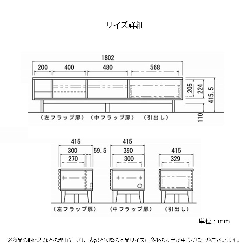 左側・中央のフラップ扉はゆっくり閉まるスローダウン仕様です。扉内には可動棚がそれぞれ1枚あり20mmピッチ2段階で調整が可能です。右側の引出しにはDVDやCDなどが収納でき、奥まで開くフルスライドレール仕様でスムーズな開閉です。