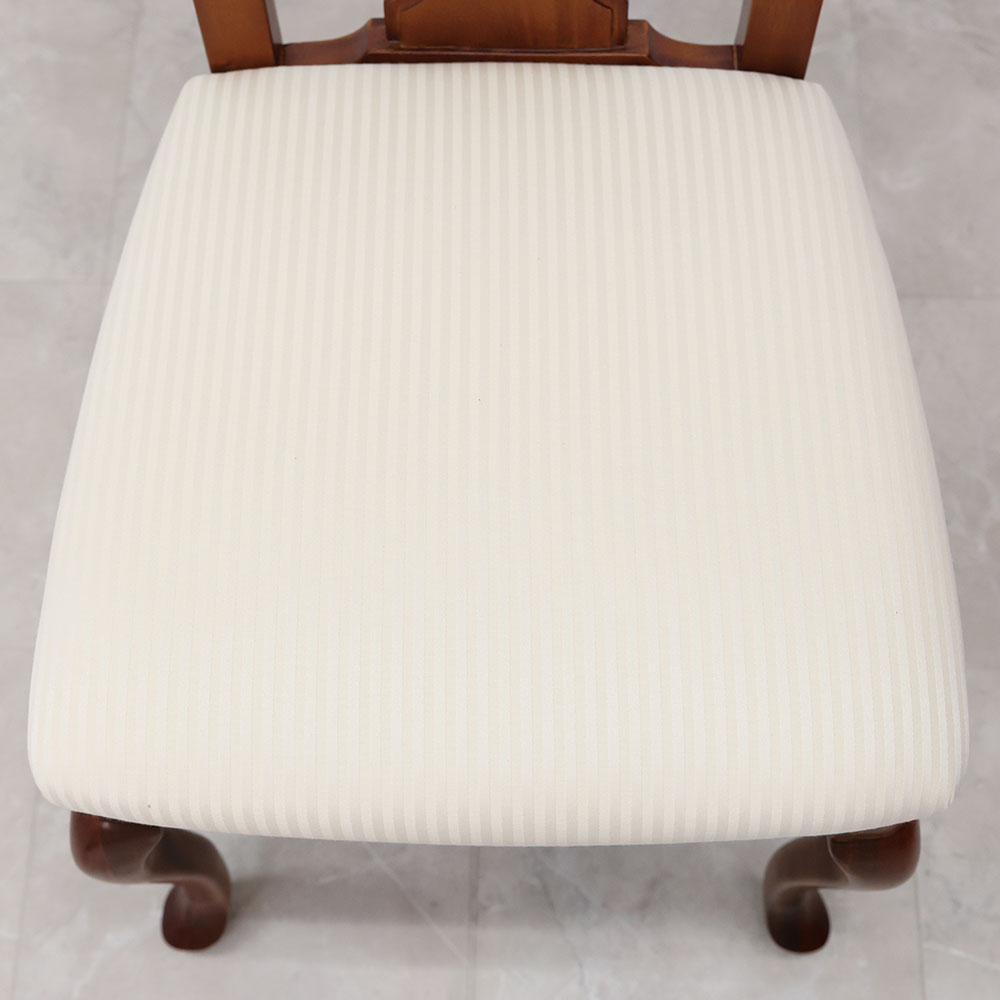 座はウレタンフォームにSバネとウェービングテープの構造で、弾力のあるしなやかな座り心地です。座面はアイボリーの細いストライプ柄のファブリックを張った、クィーンアン様式のエレガントなダイニングチェアです。