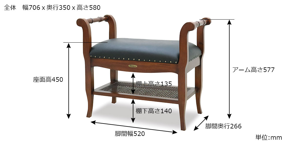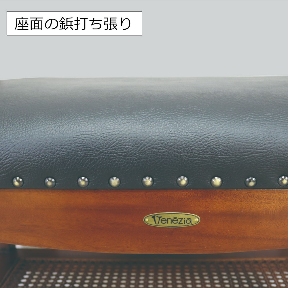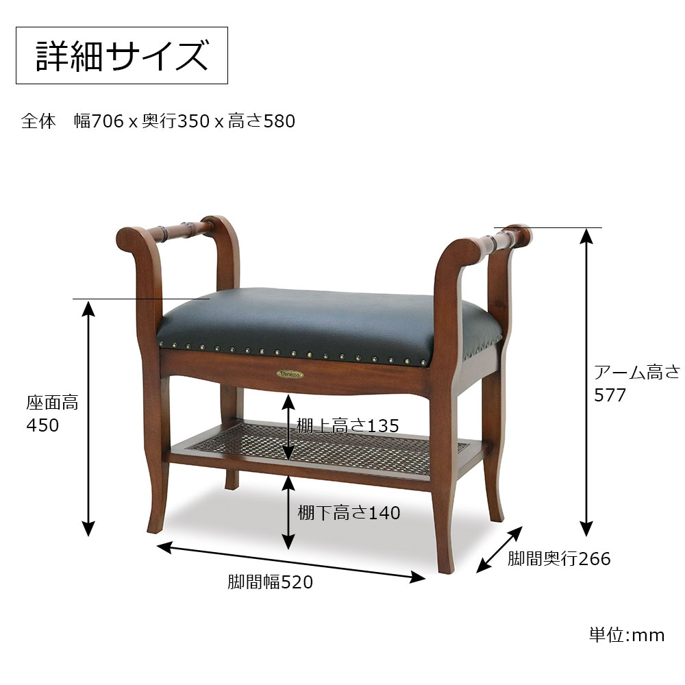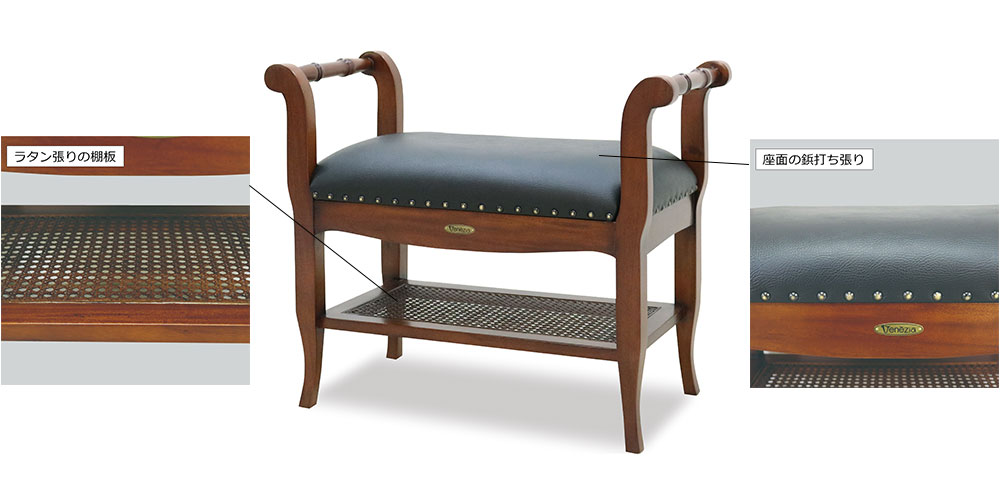玄関やリビングまたは寝室などで、ちょっと腰を掛けたいときに便利な猫脚タイプのスツール。座面は黒の合成皮革張りで、鋲打ちで固定した上質な作りとなっております。ラタン張りの固定棚にはスリッパや小物が置けます。また握り易いアームが立ち上がりを優しくサポートします。