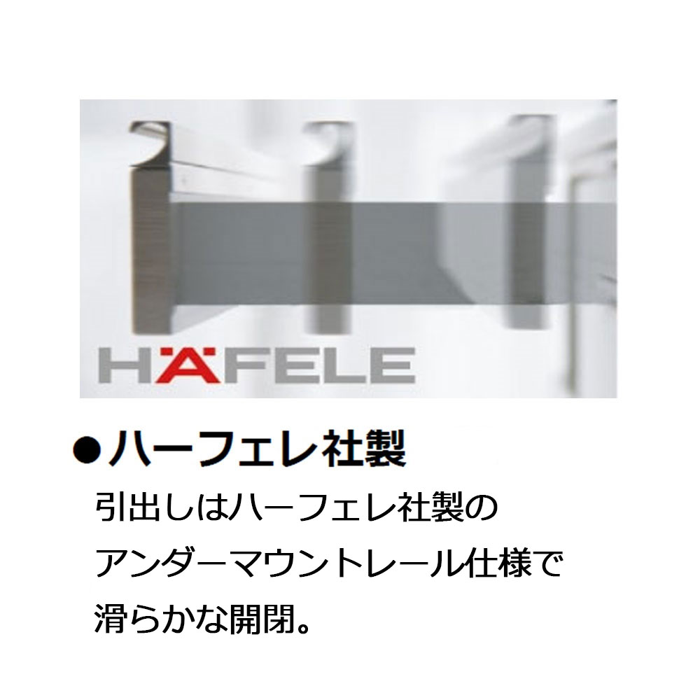 引出しにはドイツ、ハーフェレ社製のアンダーマウントレールを使用。静かでスムーズな開閉が可能です。また、すっきりとした引手がスマートな印象です。※耐荷重量は参考値であり保証値ではありません。