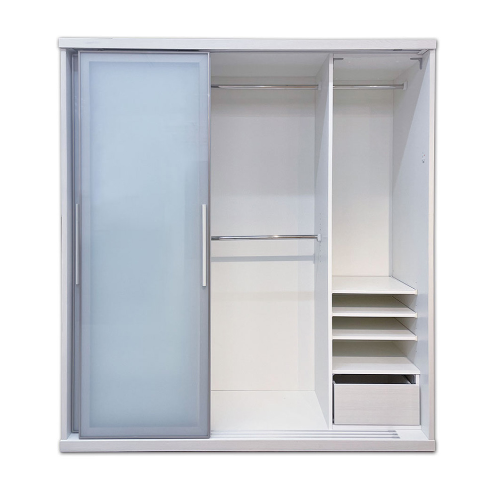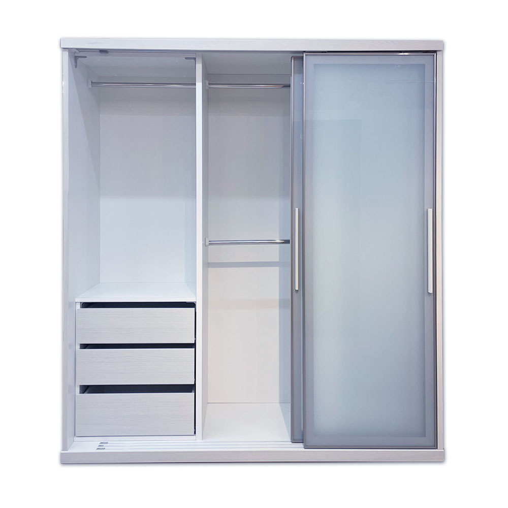 左右両開きの引き戸タイプで、大容量の収納が叶うワードローブです。内部の収納は吊りパイプ、引出し、可動棚と使い勝手の良い仕様となっており、細分化された収納スペースに綺麗に収納することができます。乳白色のガラス扉は、半透明なので高級感がありながら圧迫感を軽減しています。