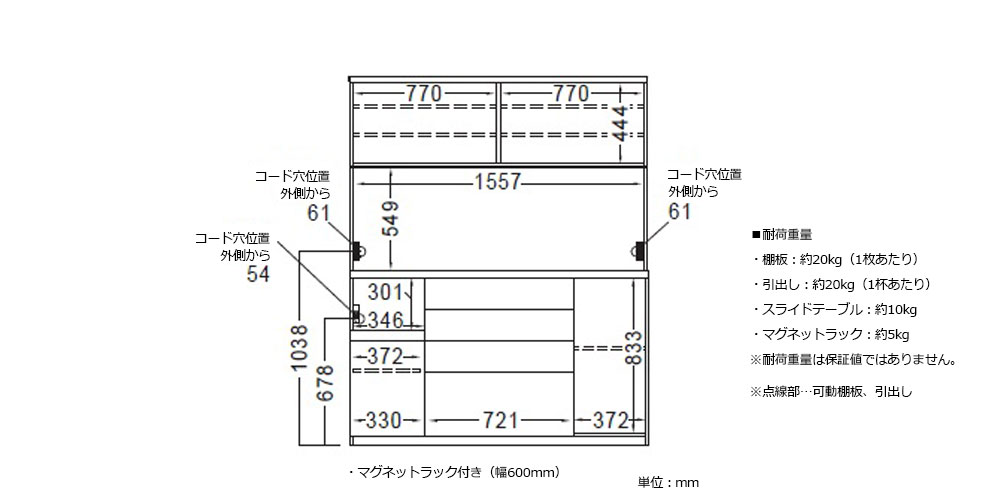 下台家電収納部分:2口コンセント(1500Wまで)X1