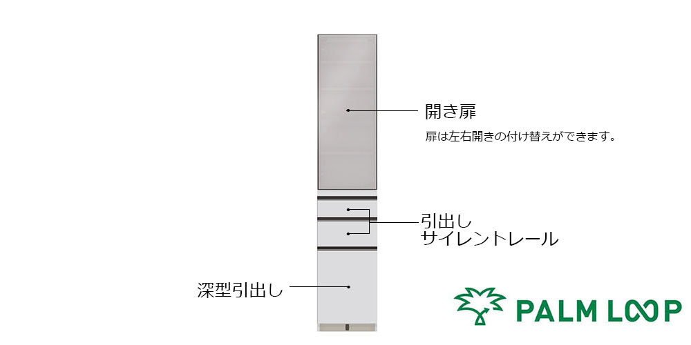 家電収納スペース下の深型引出しには背の高いものやダストボックスが収納できます。別売りのパモウナ「オプションダストボックス」の15Lタイプ2個、または26.5Lタイプ1個を収納できます。ダストボックスを収納しない場合は、引出し内に棚板を設置することも可能です。※画像はイメージです。
