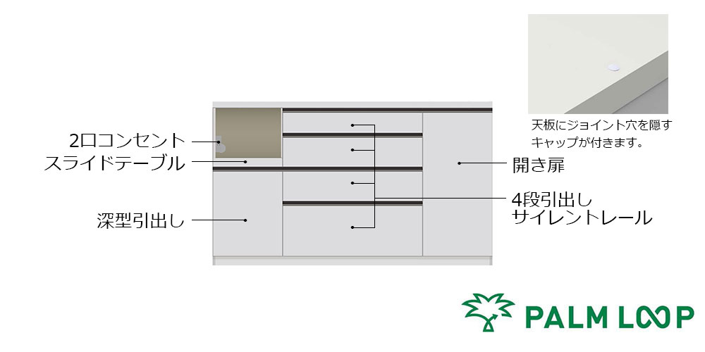 家電の収納に便利なスライドテーブル式です。家電を収納しない場合は棚板を設置することで収納スペースとしてもお使いいただけます。※棚板は家電収納下の引出し内部の棚板と共有です。
