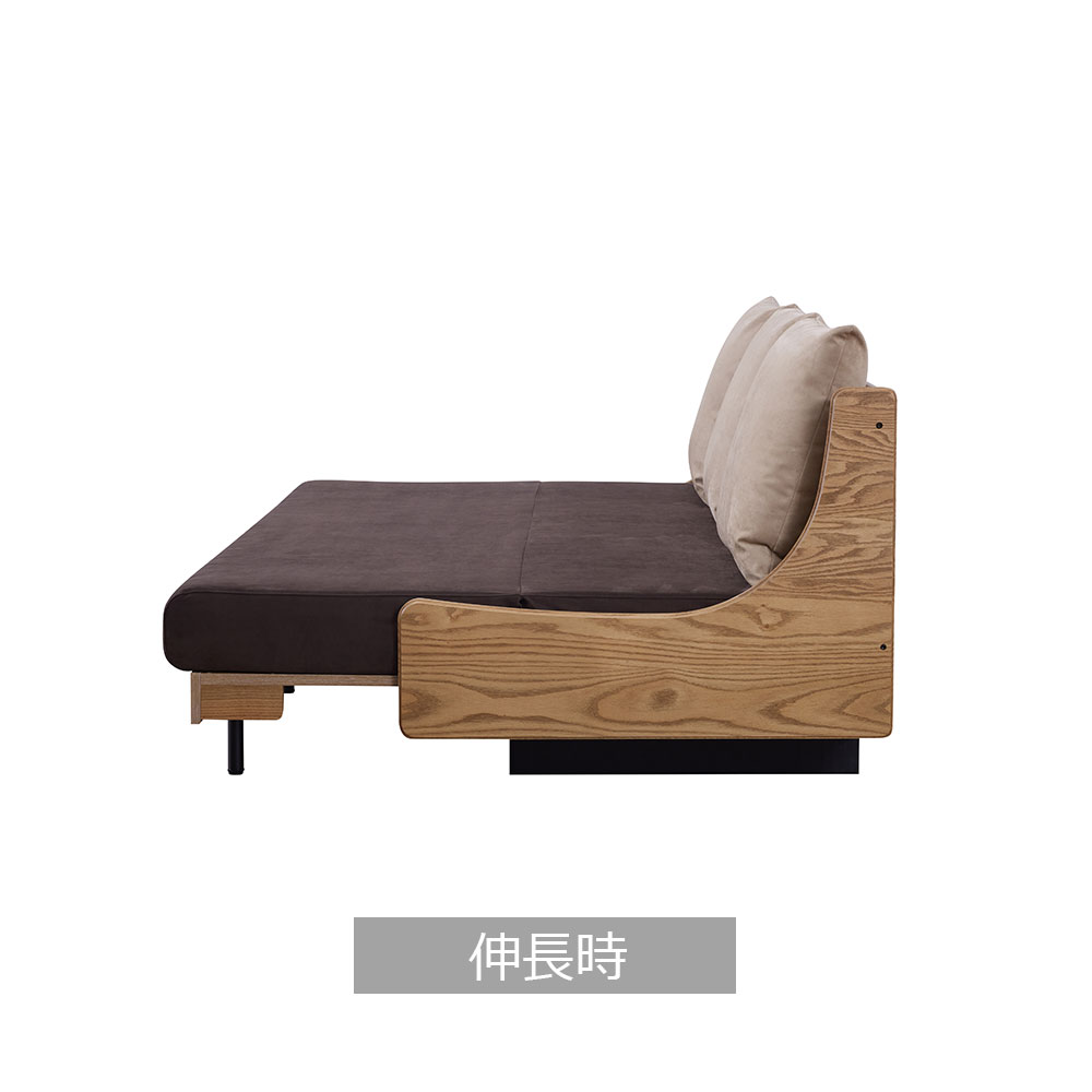 木の温かみを感じられるフレームに、スチール製の前脚を合わせたすっきりとしたデザインのソファベッドです。ソファとしてはもちろん、座面を伸ばすことで脚を伸ばしてくつろいだり横になったりすることができ、ライフスタイルに合わせてお使いいただけます。※画像は「フォース 200(布BE×木部VN)」のイメージです。