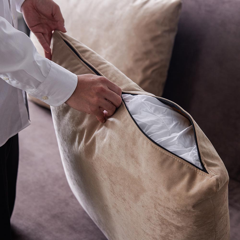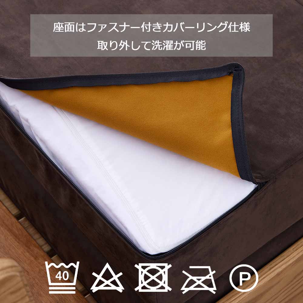 張地は、引っ掻きに強く、髪の毛や細かいゴミが絡みにくいスウェード調の滑らかな生地を使用しています。ファスナー付きのカバーリング仕様なので、汚れた際は取り外して洗濯が可能です。座面クッションはキルティング加工したインナーカバーを採用することでALLウォッシャブルを実現し、清潔にお使いいただけます。