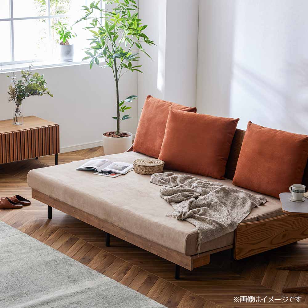 伸長時はゆったり脚を伸ばせるセミダブルサイズに。3分割した置きクッションはボリュームを持たせ、伸縮時・伸長時問わず背もたれや枕代わりになりごろ寝をサポートします。※画像はイメージです。