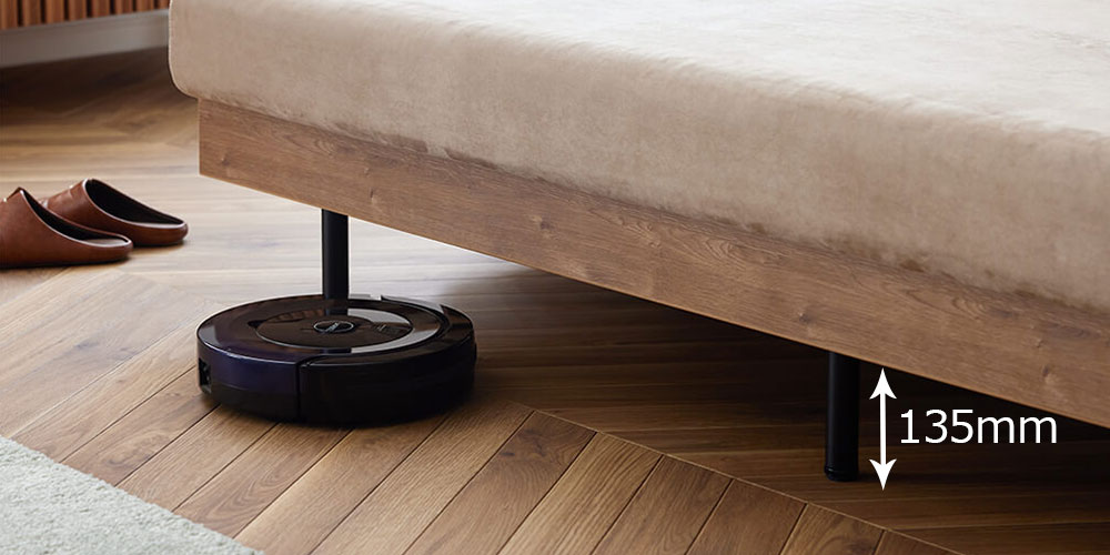 前脚はモダンな印象のスチール製。座面下のスライド部までは13.5cmとロボット掃除機も通るよう設計しており、掃除の時短をサポートします。また、空間を設けることで軽量化を図り、軽い力でよりスライドしやすくなっています。