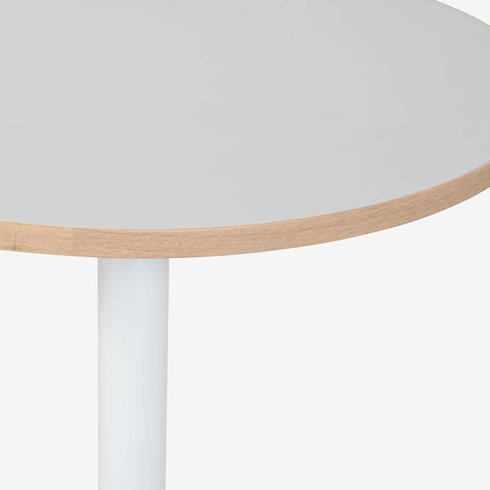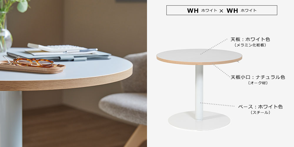 ホワイト天板と、ベース部にもホワイト色スチールを合わせた清潔感があり明るい印象です。天板小口面のナチュラル色(オーク材)がさりげないアクセントになっています。