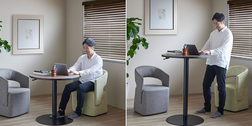 天板の高さ640mm〜1030mmと可動範囲が広く、ダイニングやラウンジだけでなく、スタンディングデスクとしてもご使用いただけます。※画像は色違いWN/BKを使用したイメージです。