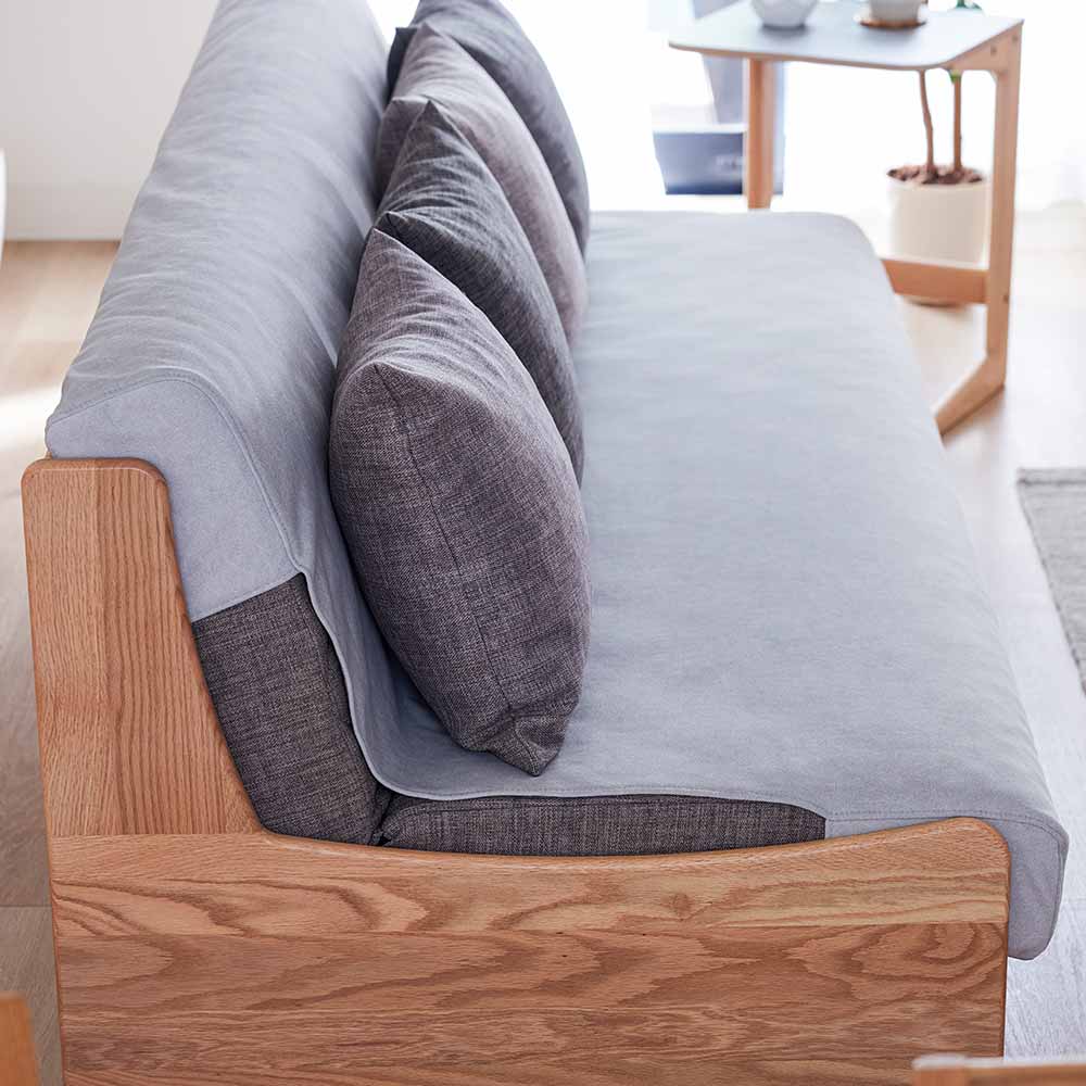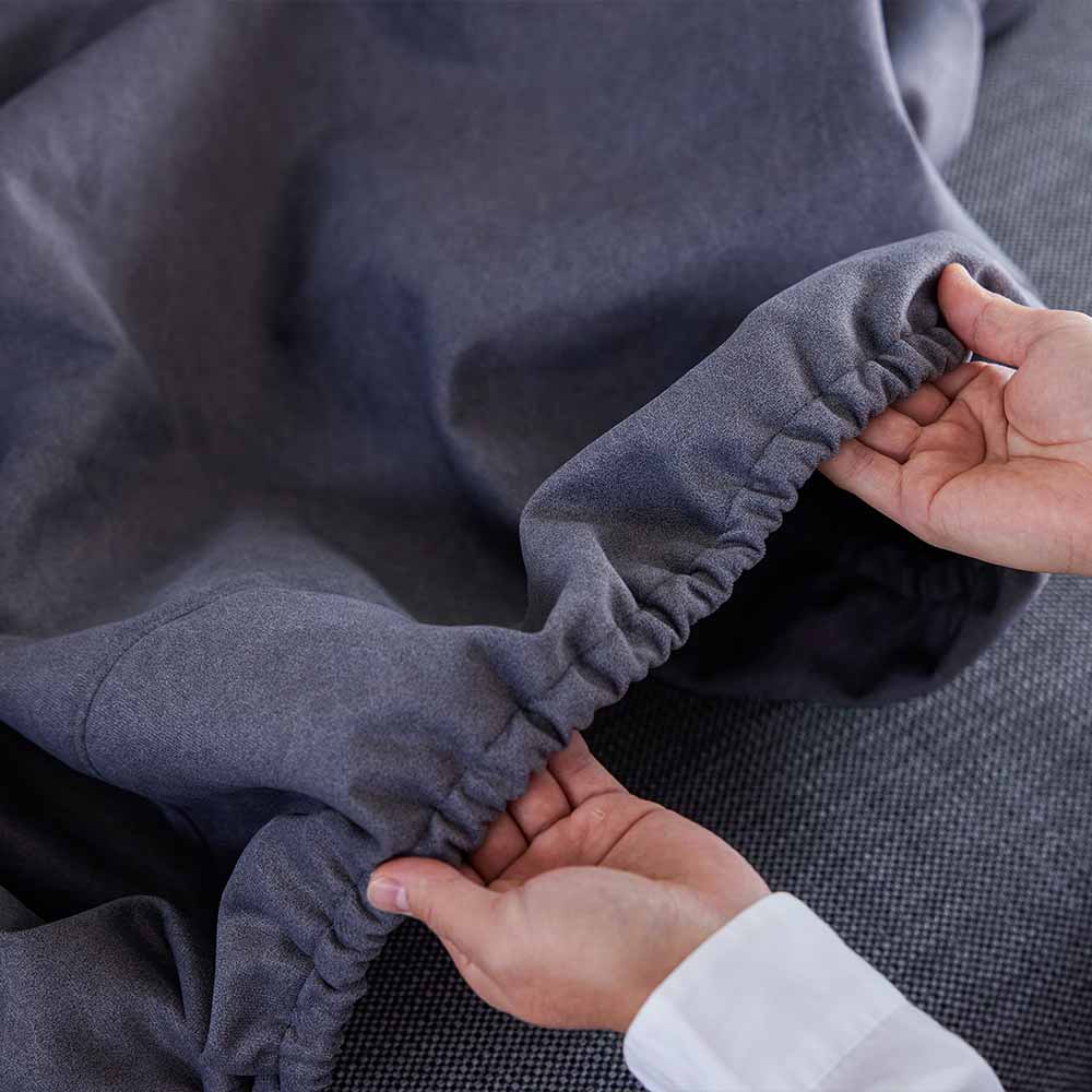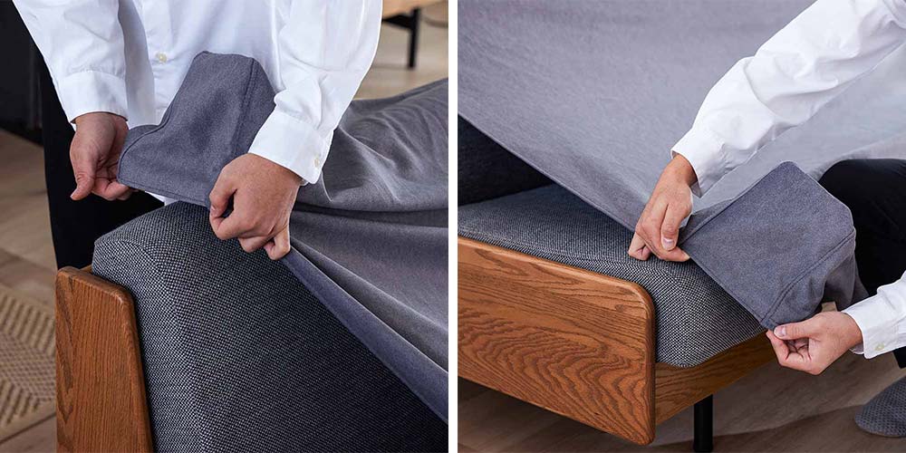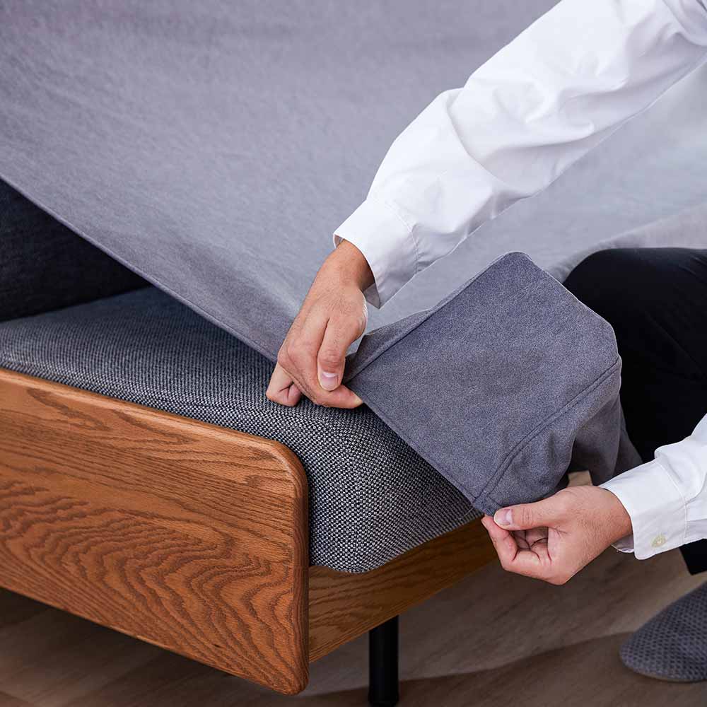 ソファの座面表側にらくらくカバーを覆いかぶせ、背もたれや座面の四隅にカバーを差し込むだけで取付けできます。付け外しが簡単なボックスシーツタイプなので、汚れが気になった時に気軽にメンテナンスしていただけます。