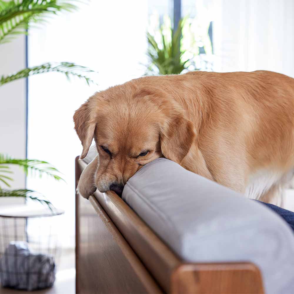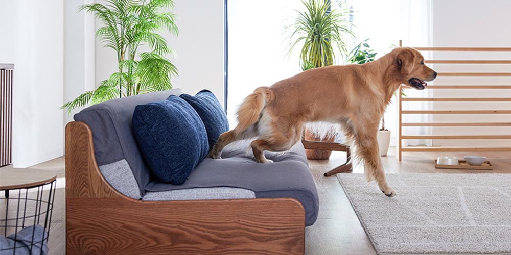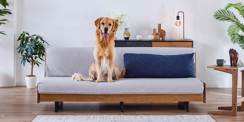 使用している生地は、ペットの爪が当たっても引っ掛かりにくいため傷が入りにくく、なめらかな触り心地で毛が絡みにくい特徴があります。粘着ローラーや掃除機で簡単にお掃除ができます。