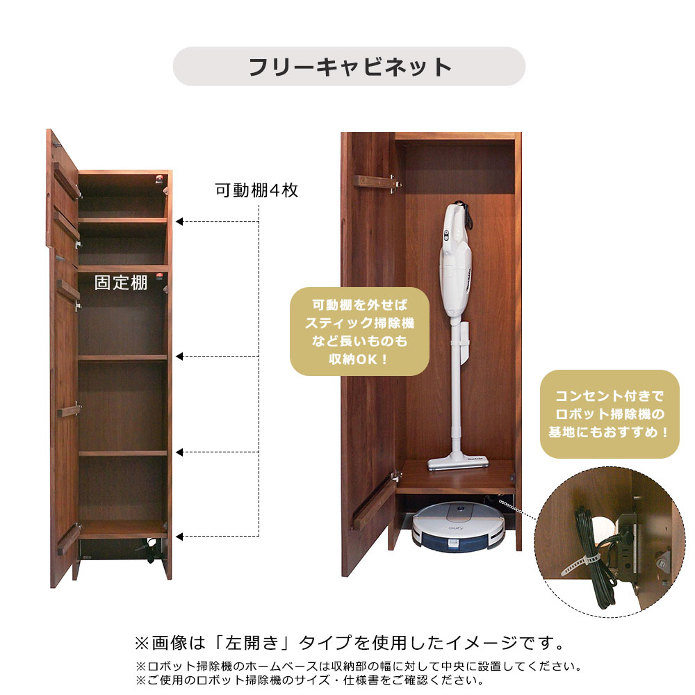 フリーキャビネットは内側にコンセント(2口)付きで、扉下部は高さ約12cmのスペースが空いているため、お掃除ロボットの基地としても使えます。可動棚を外せばスティック掃除機など長い物も収めることができます。