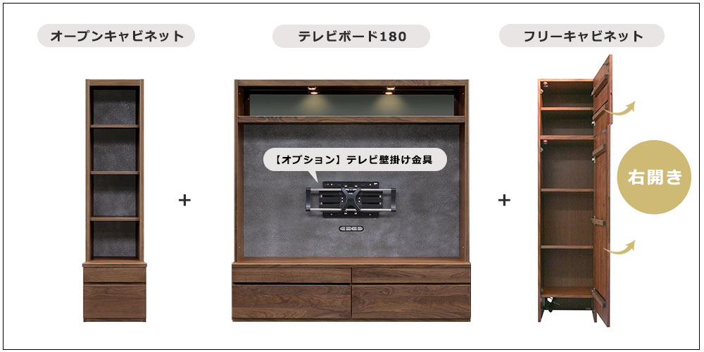 ※画像はフリーキャビネット(左開き)+テレビボード+オープンキャビネットの3点レイアウトと、テレビ壁掛け金具(オプション)を使用したイメージです。テレビは別売りです。
