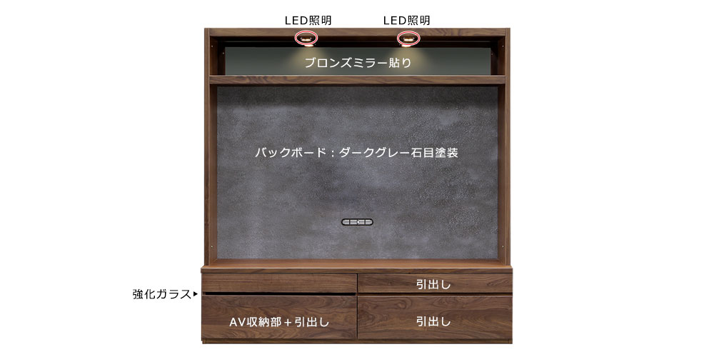 ウォールナット材、強化ガラス(TVボード扉)、ブロンズミラー