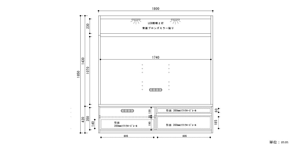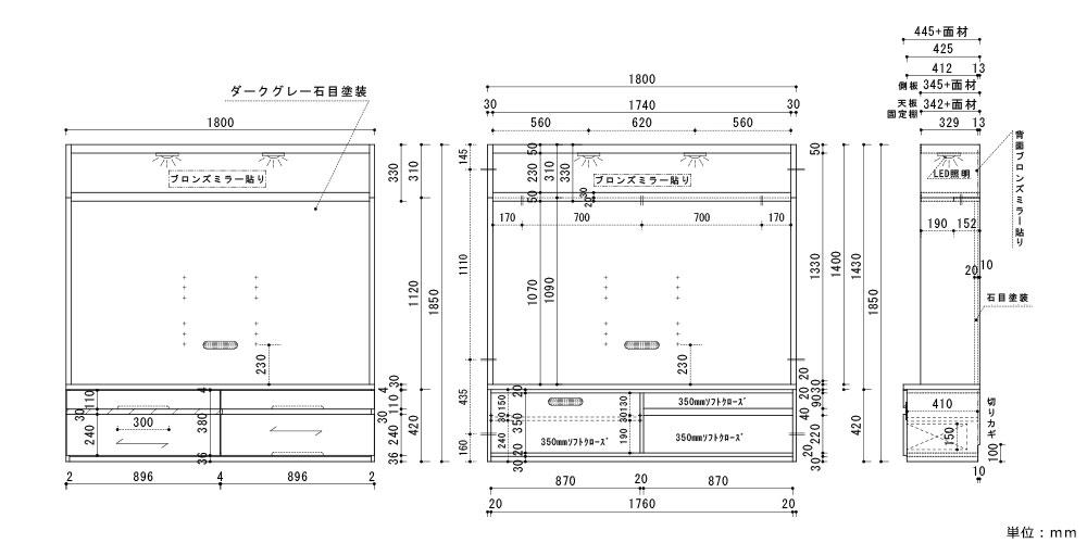 | テレビボード本体 | 幅1800x奥行450x高さ1850 |