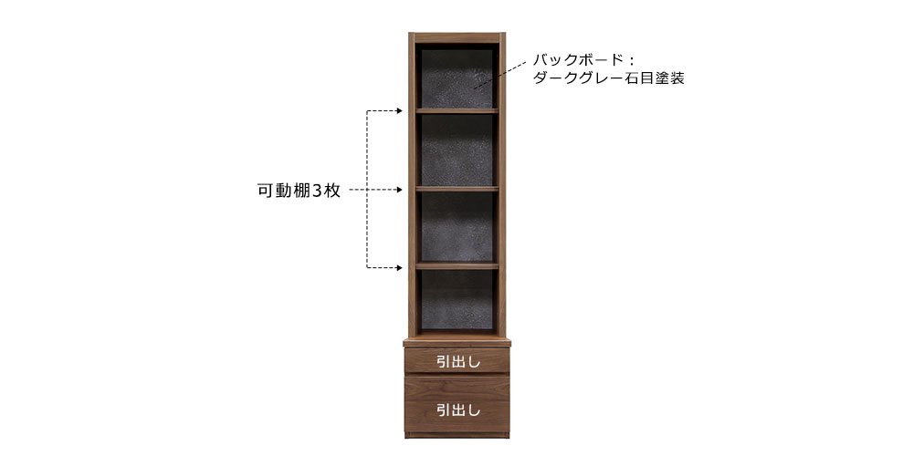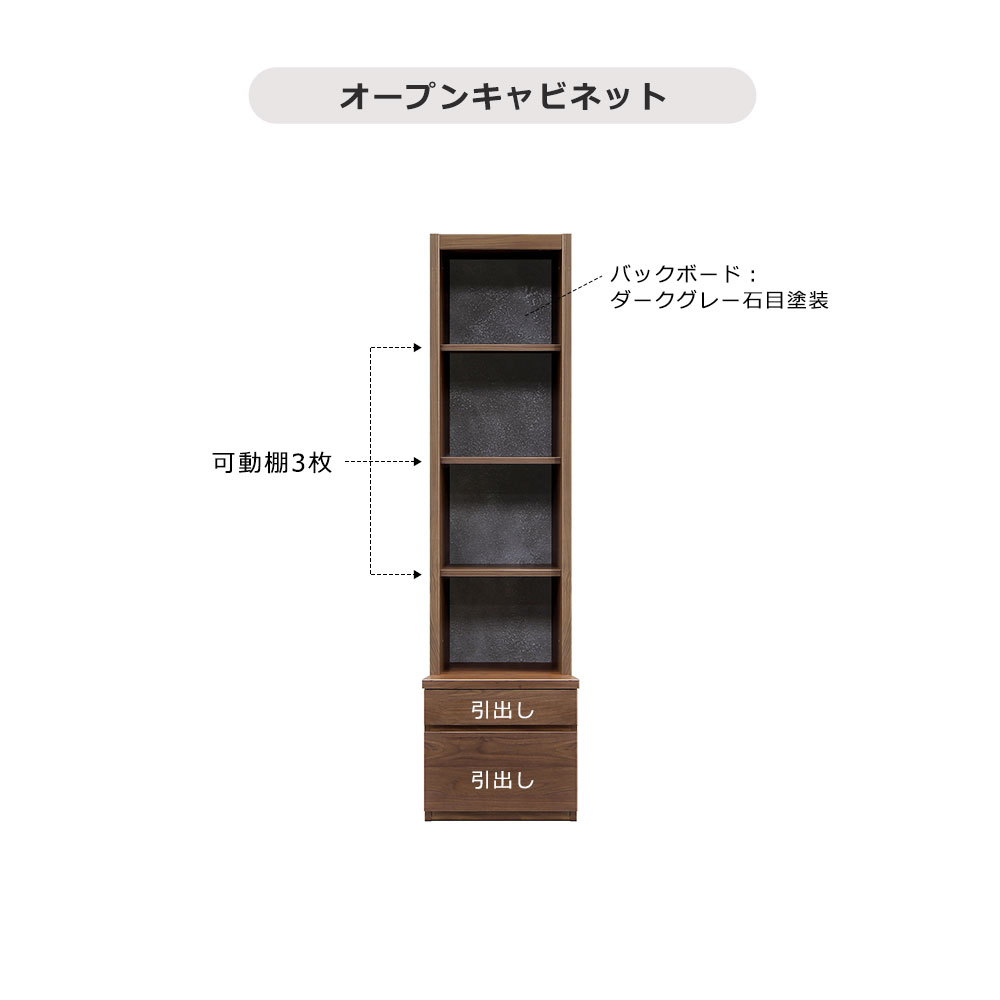 バックボードはテレビボードと同様にストーンフィニッシュ加工でディスプレイを引き立ててくれます。オープン部は可動棚3枚で飾りたいものに合わせて高さの調整可能、下部は引出し2段で小物収納に便利に使えます。