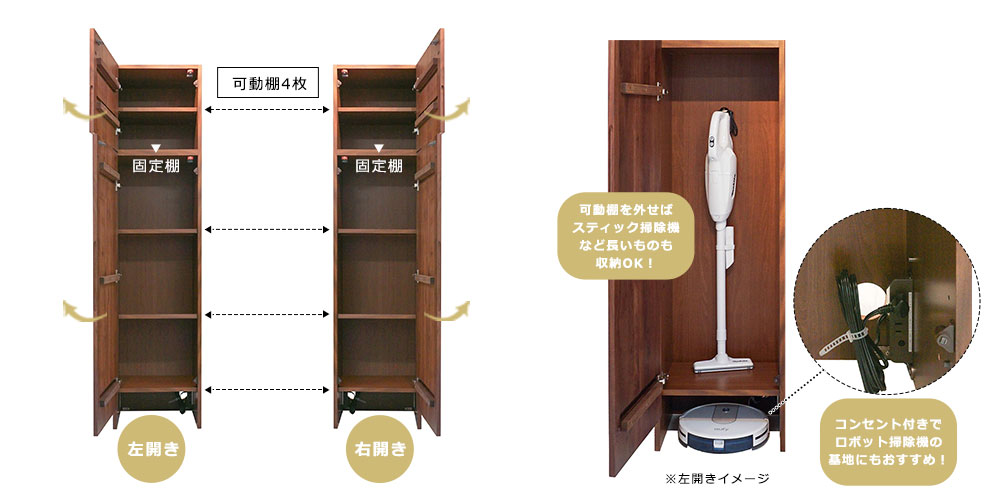 フリーキャビネットは内側にコンセント(2口)付きで、扉下部は高さ約12cmのスペースが空いているため、お掃除ロボットの基地としても使えます。可動棚を外せばスティック掃除機など長い物も収めることができます。