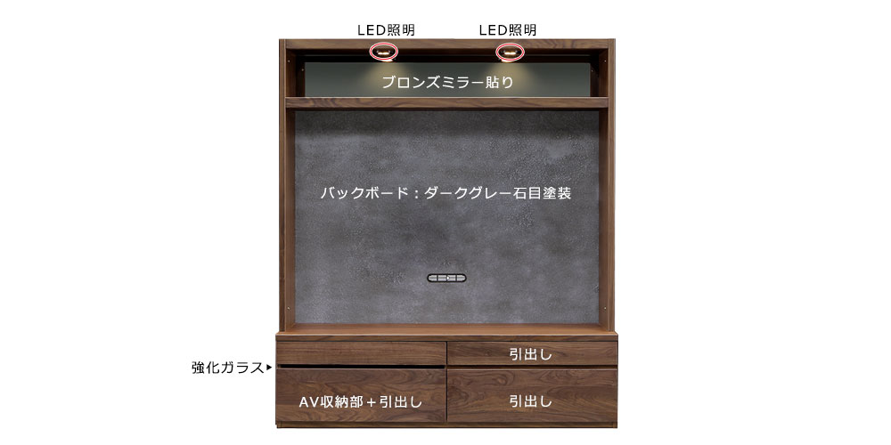 ウォールナット材、強化ガラス(TVボード扉)、ブロンズミラー