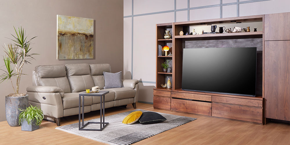 ウォールナット材と石目塗装のコントラストが美しいテレビボード