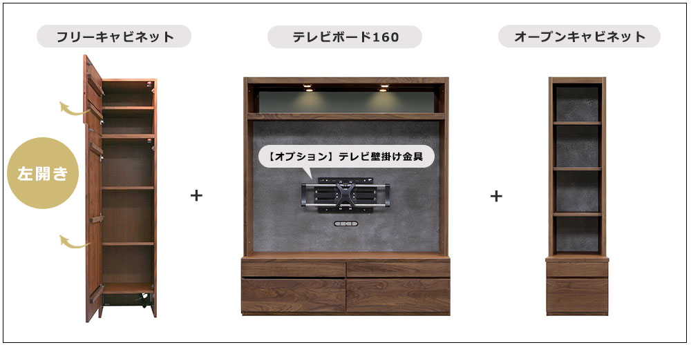 ※画像はフリーキャビネット(左開き)+テレビボード+オープンキャビネットの3点レイアウトと、テレビ壁掛け金具(オプション)を使用したイメージです。テレビは別売りです。
