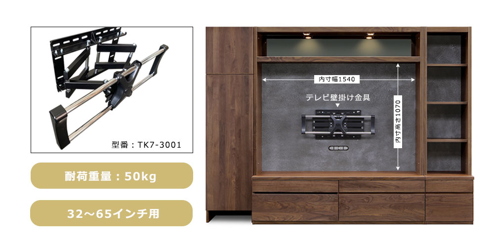 ・取付可能範囲の目安は32〜65インチです。テレビ台の有効内寸は幅1540×高さ1070mmとなりますので、取付予定のテレビのサイズがテレビ台内寸に収まるかご確認ください。