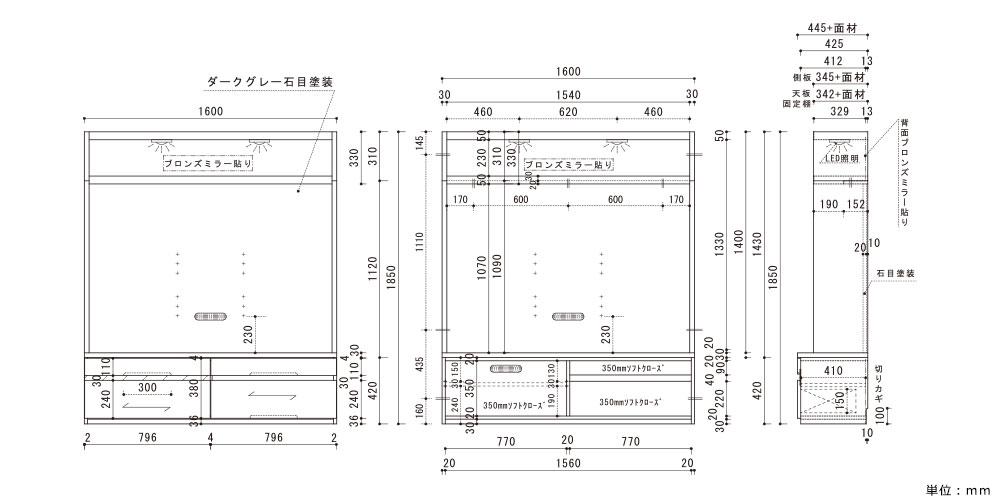 | テレビボード本体 | 幅1600x奥行450x高さ1850 |