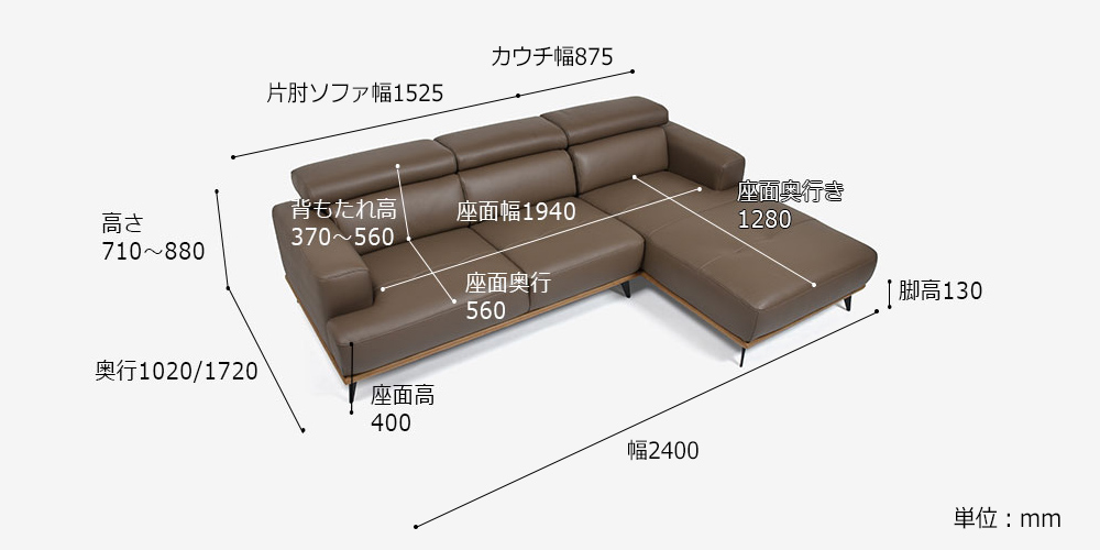 カウチソファ 向って右カウチ「ブレシア」幅240cm 半革#M-07 トープ色