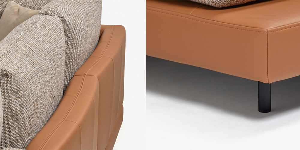 背クッションの中材は、ポリウレタンフォーム、マイクロファイバー繊維100%が使用されており、柔らかく身体にフィットします。また、背クッションのキャシャレルステッチ(タック)がデザインのアクセントに。