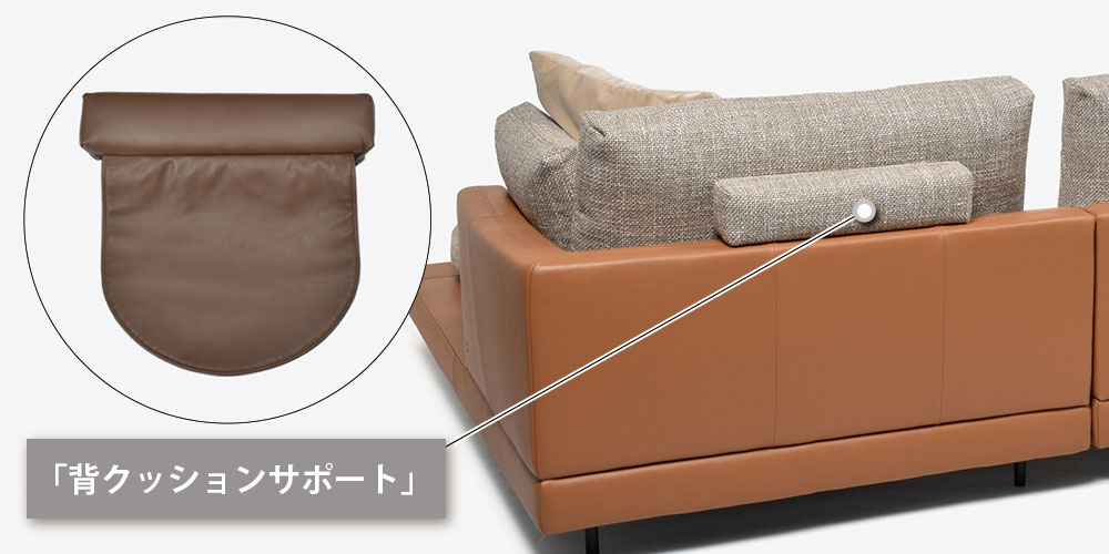 背クッションサポートが1個付属します。背クッションを補強をすることで身体を預けた際に、首・頭までしっかり支えます。差し込み式の為、気軽に掛け心地を変えてお使いいただけます。