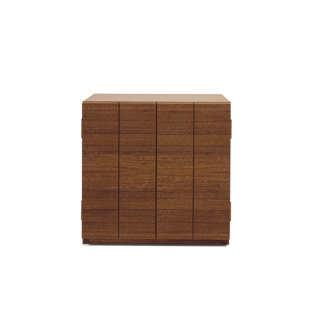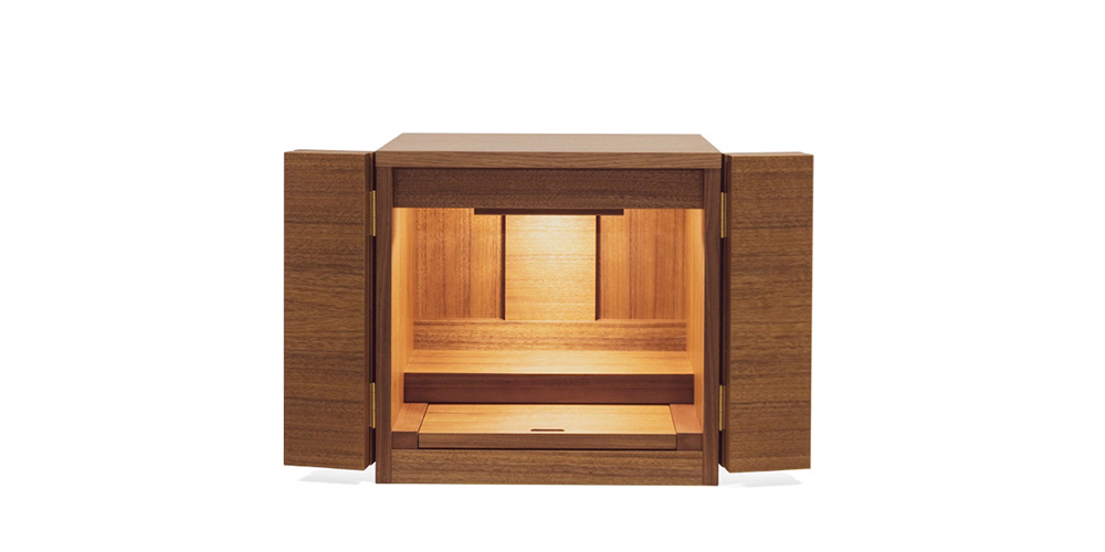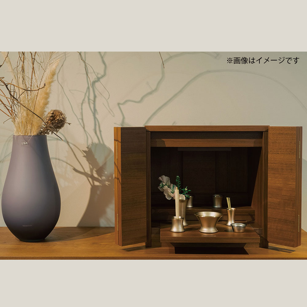 「追憶」の花言葉をもつシオンから名付けられた、現代の住空間に調和するシンプルでコンパクトタイプの仏壇です。ウォールナット材突板の直線的な木目である柾目を使用しており、扉を閉めた姿も美しい佇まいです。