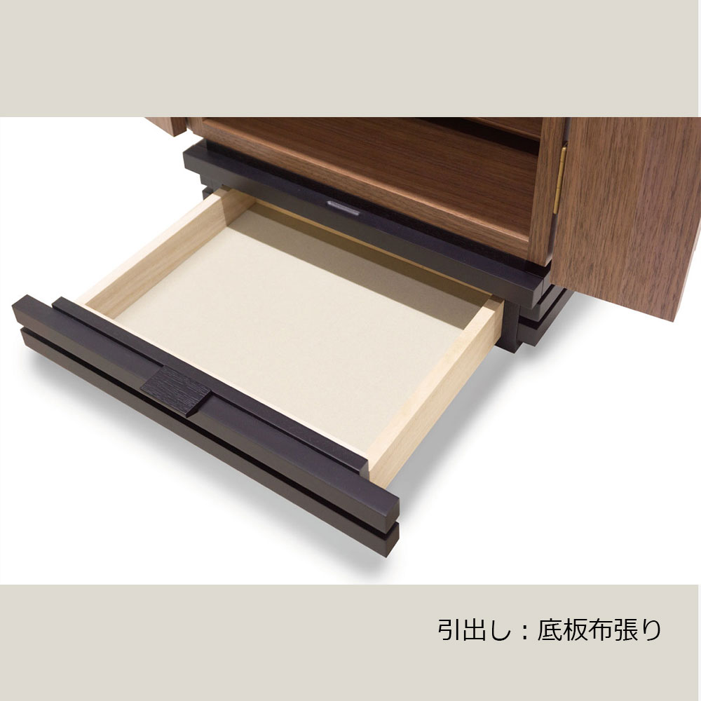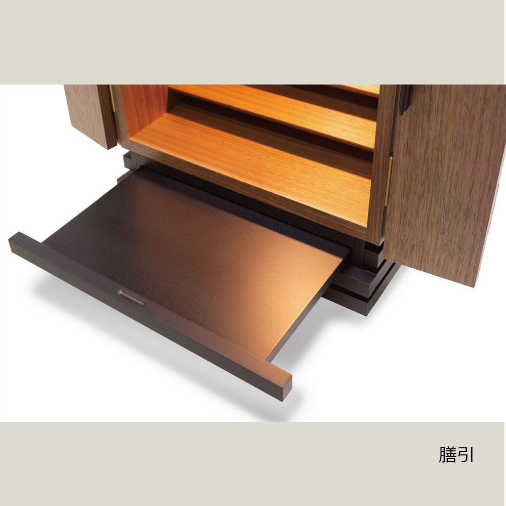 下部には膳引と仏具等を収納できる引出し付きです。引出し内部は布張り仕様で、袱紗やお線香、ろうそくなどを保管できます。