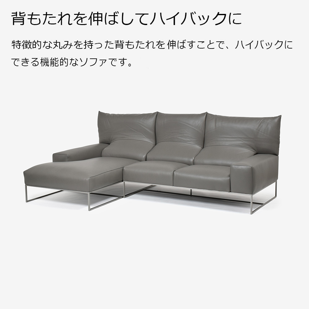 特徴的な丸みのあるデザインの背もたれを伸ばすことでハイバックにできる機能的なソファです。 座面には高密度ウレタンとフェザーを使用し、身体にやさしくフィットする座り心地です。家具工場が母体のブランドだからこそ、充実した自社設備を用いた高品質な構造が魅力です。