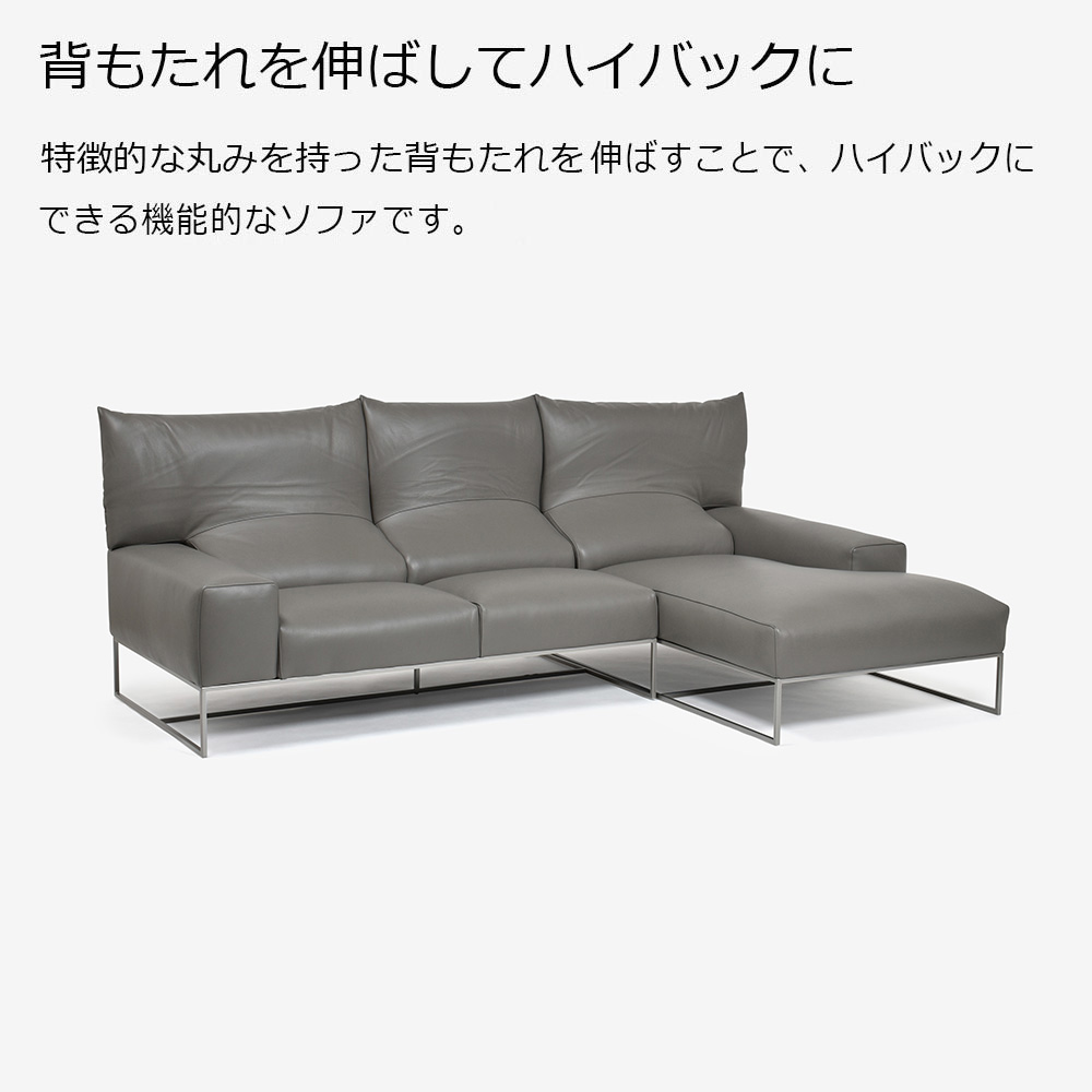 特徴的な丸みのあるデザインの背もたれを伸ばすことでハイバックにできる機能的なソファです。 座面には高密度ウレタンとフェザーを使用し、身体にやさしくフィットする座り心地です。家具工場が母体のブランドだからこそ、充実した自社設備を用いた高品質な構造が魅力です。