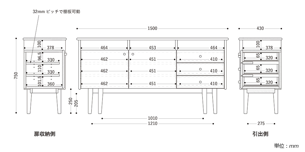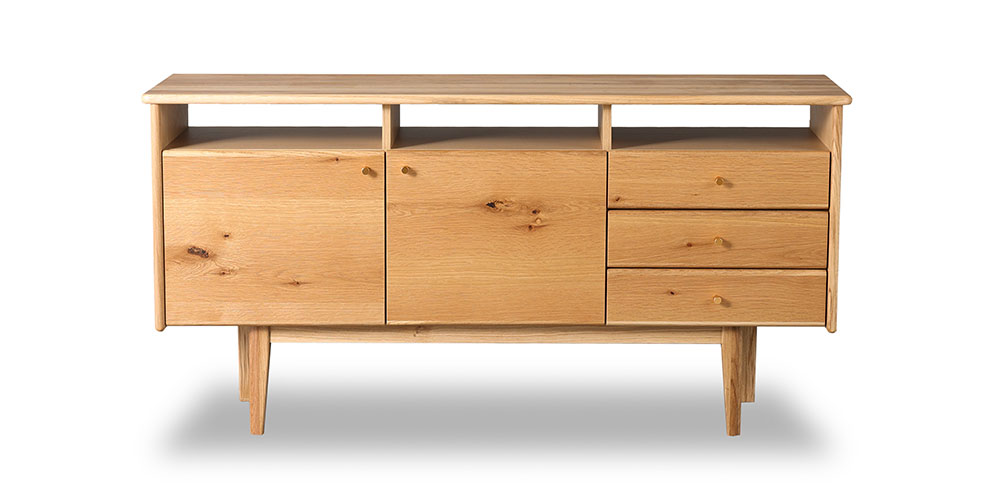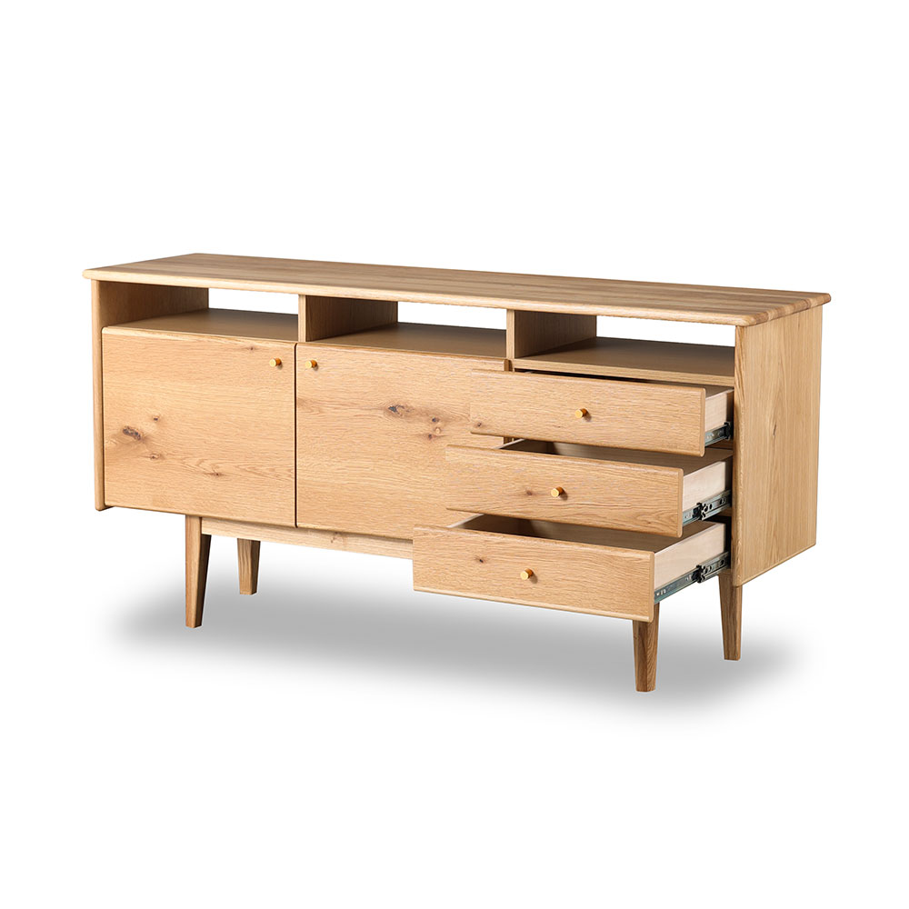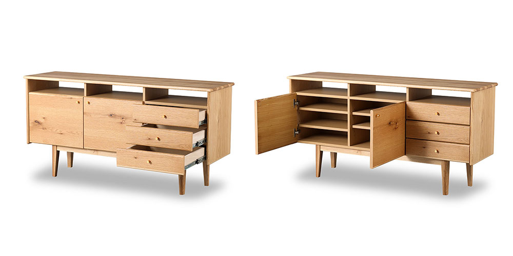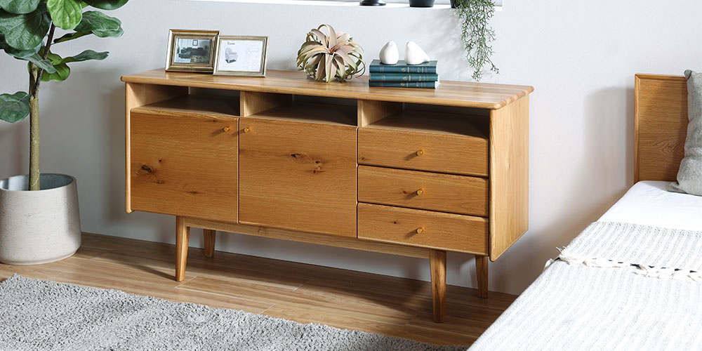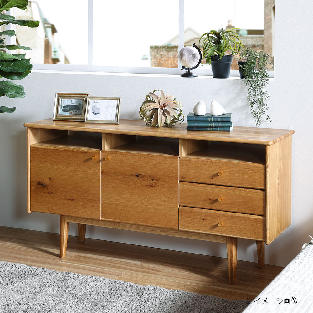 寝室でもリビングでも使いやすく、ハイタイプのテレビボードとしてもお使いいただけるサイドボードです。引出しと開き扉収納の2タイプの収納スペースで様々な収納物に対応します。