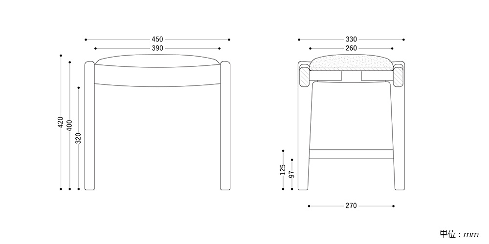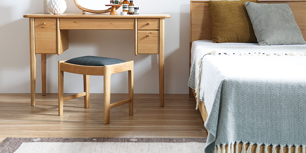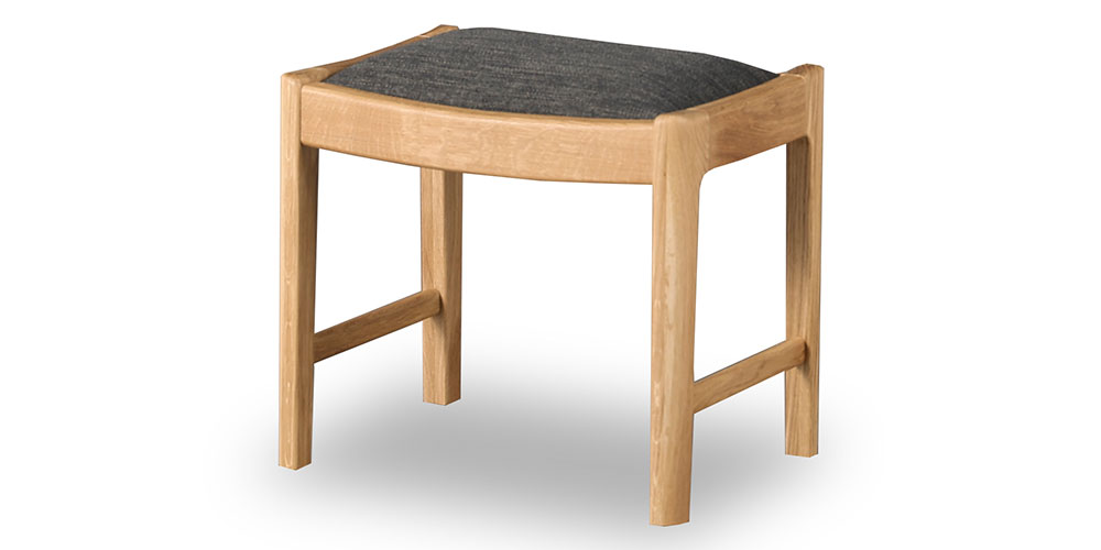 優しいフォルムに仕上がるよう、脚や幕板に丸みを持たせ、ディテールにこだわったスツールです。シリーズのドレッサーと合わせて使っていただいても、単体でちょっとした腰掛にもお使いいただけます。