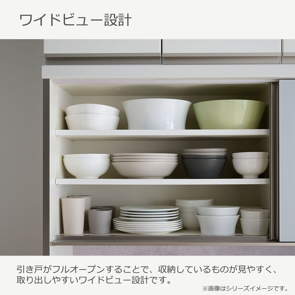 引き戸がフルオープンすることで、収納しているものが見やすく、取り出しやすいワイドビュー設計の引き戸です。