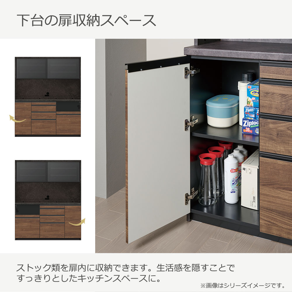 ストック類を開き扉内に収納できます。生活感を隠すことですっきりとしたキッチンスペースを叶えます。
