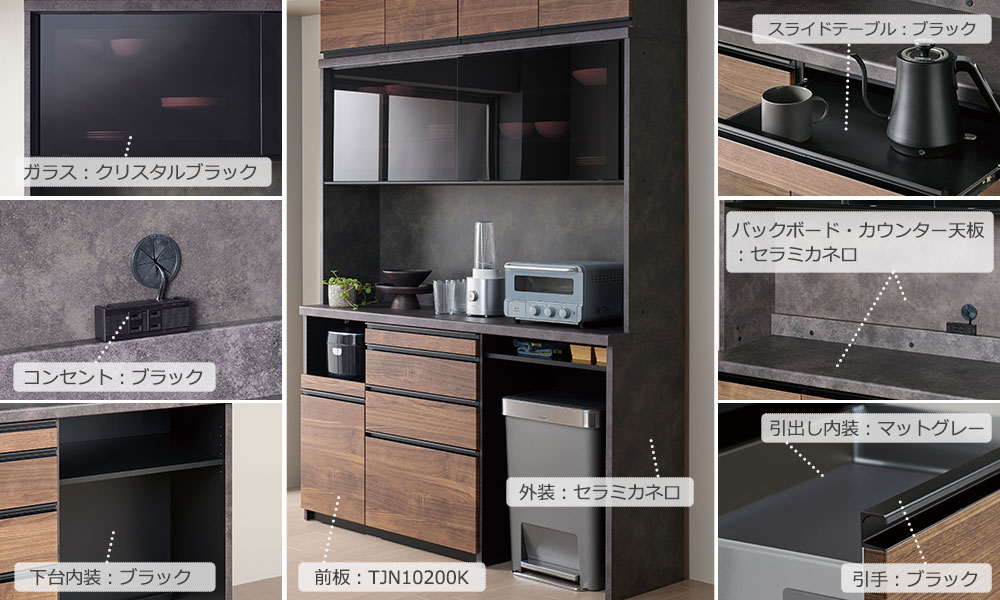 ウォールナット木目調の前板(TJN10200K色)とブラックの石目柄(セラミカネロ色)の組み合わせで、天然の木目柄を再現したリアルなカラーやマットな質感が上質な空間にマッチします。メラミン化粧板の前板は、耐熱性、耐水性、耐摩耗性などに優れ、キズや劣化にも強い素材です。※画像はHMシリーズのイメージです。