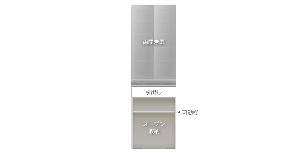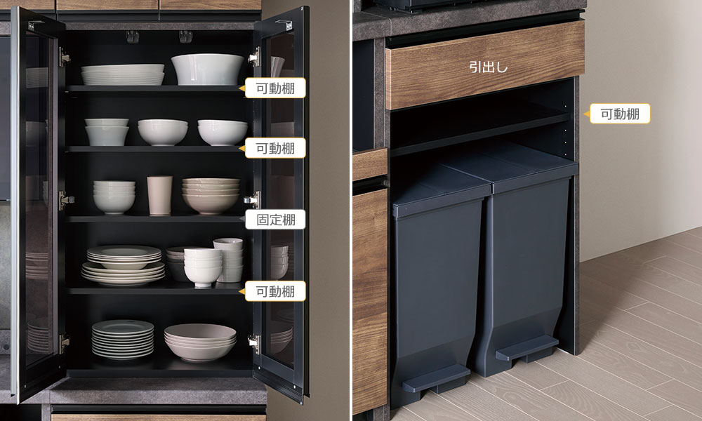 上台(写真左)はたくさんの食器を収納できる収納棚(固定棚+可動棚3枚)。両開き扉で出し入れしやすく中を一度に見渡せます。