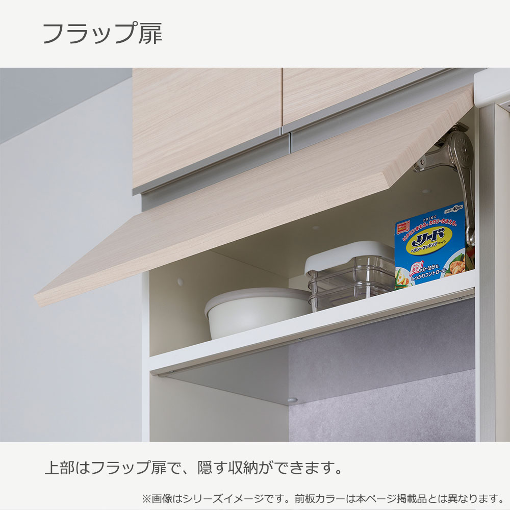 上部にはフラップ扉で隠す収納スペースがあります。また、2口コンセント付きで、配線は可動棚とバックボードの間を通すことができます。※画像はイメージです。
