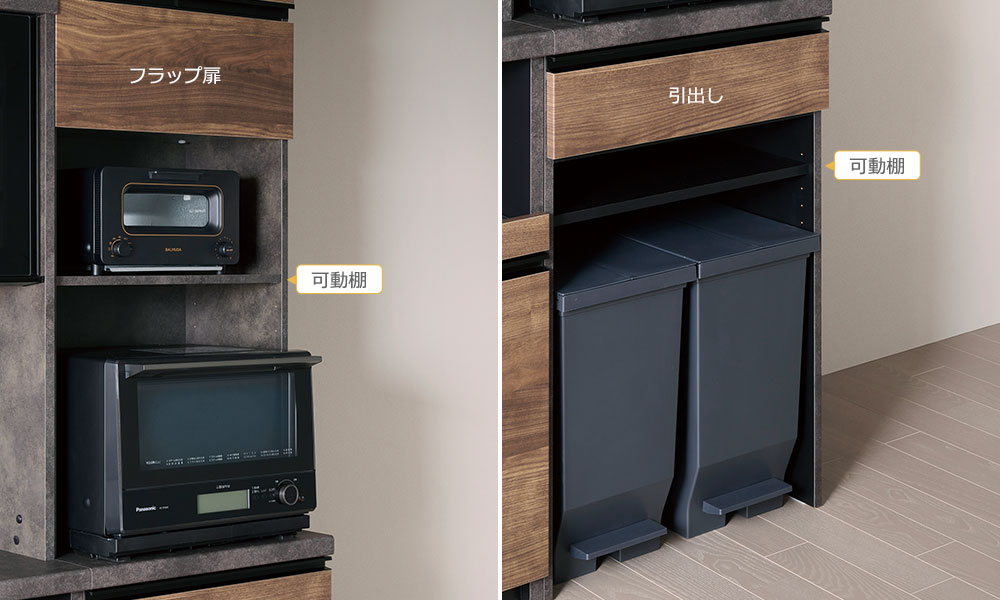 上台(写真左)はキッチン周りの家電をまとめて置けるオープン収納と、上部にはフラップ扉の収納付き。