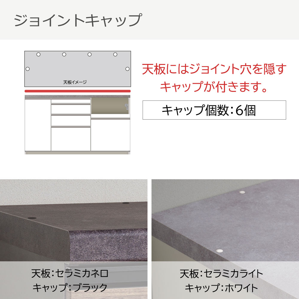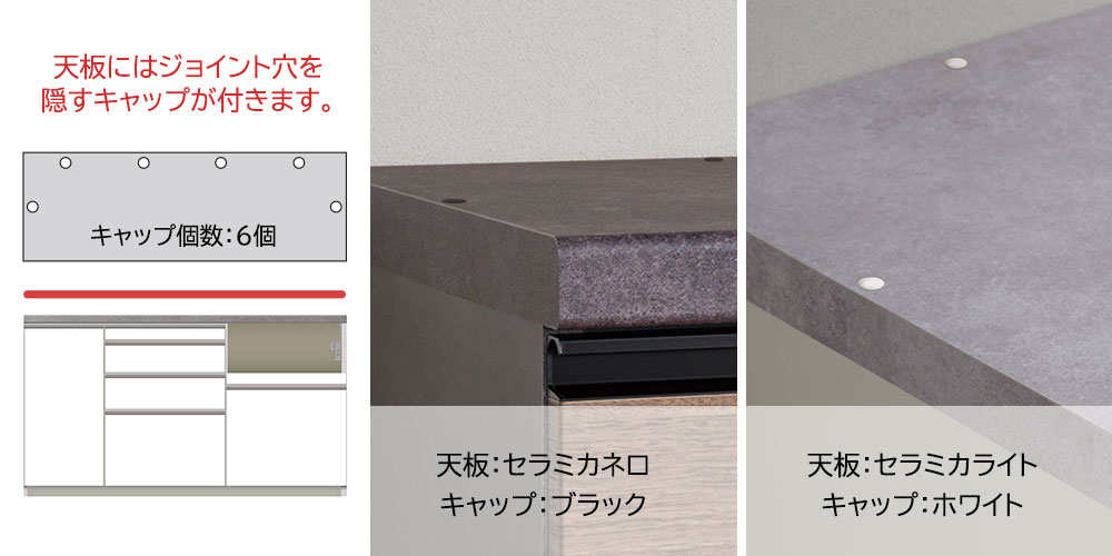 オープンボードの下台のみをカウンターとしてお使いいただく仕様です。そのため、天板には上台とのジョイント穴を隠す樹脂製のキャップが4箇所付きます。パールホワイト色にはホワイト、TJN10200K(ボディ:セラミカネロ)色にはブラックのキャップが付属します。予めご了承ください。※画像はイメージです。